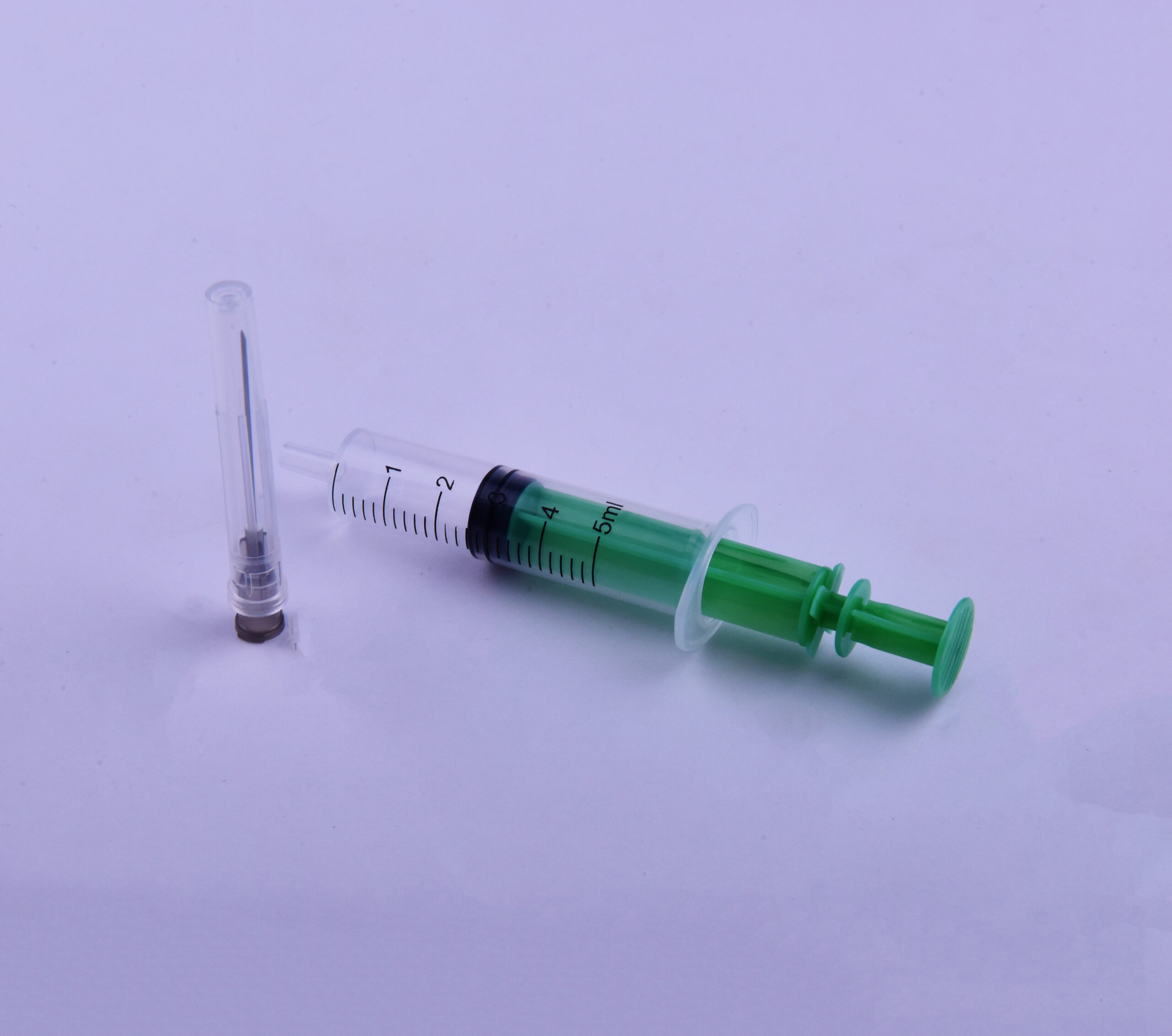 High-transparency disposable syringes available in various sizes (3ml, 5ml, 10ml).